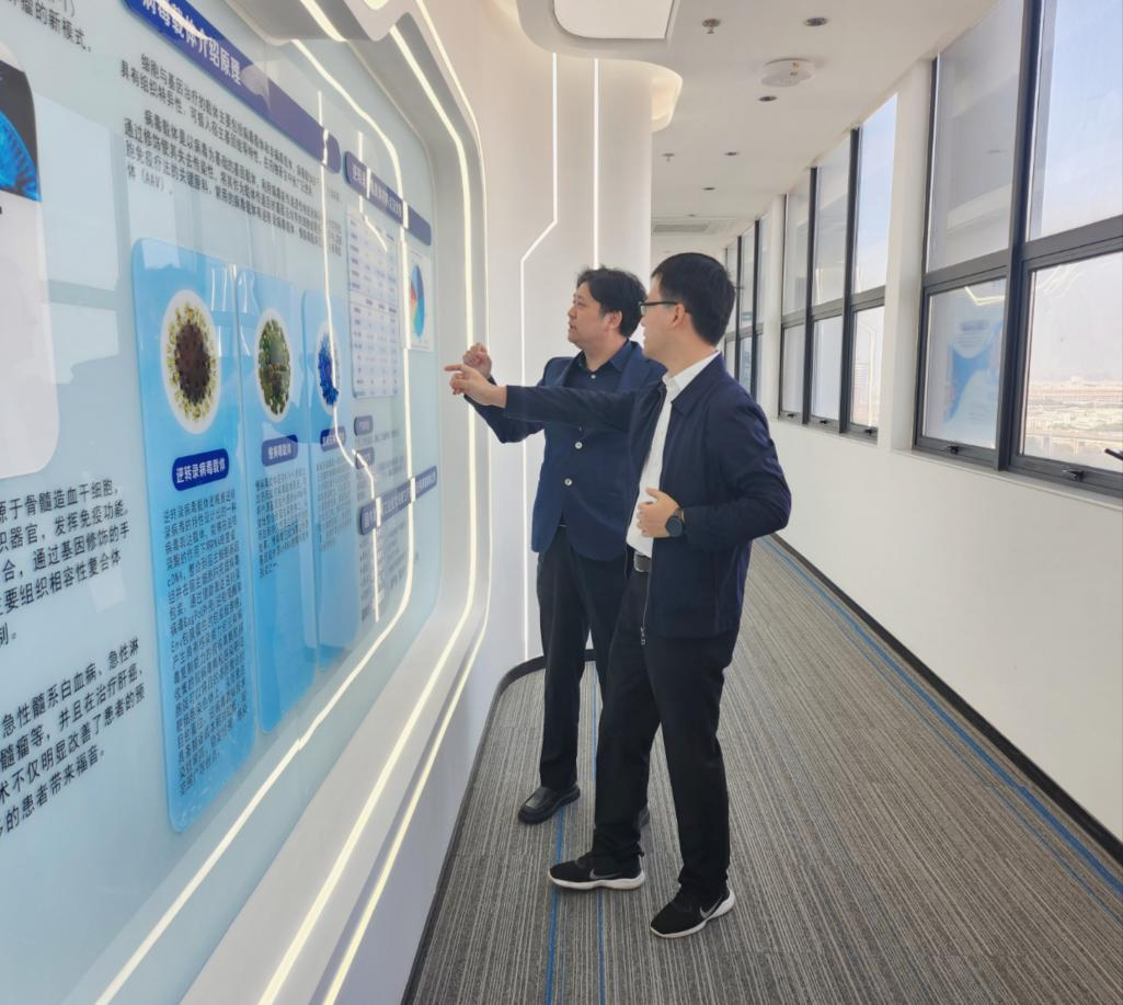 第一时间,坪山区科技创新局刘颖杰局长一行在史渊源董事长的陪同下参观了智慧展厅、生产车间及研发实验室,分析了公司的创始人团队、企业开展历程、细胞治疗的开展史及现状、服务平台建设及企业愿景等,对深圳凯发K8在生物医药这一新兴产业上、为药企给予细胞原创药物的“研发—生产—申报—人才培养”的全产业链服务,为细胞与基因治疗领域的开展赋能,给予了充分的肯定。