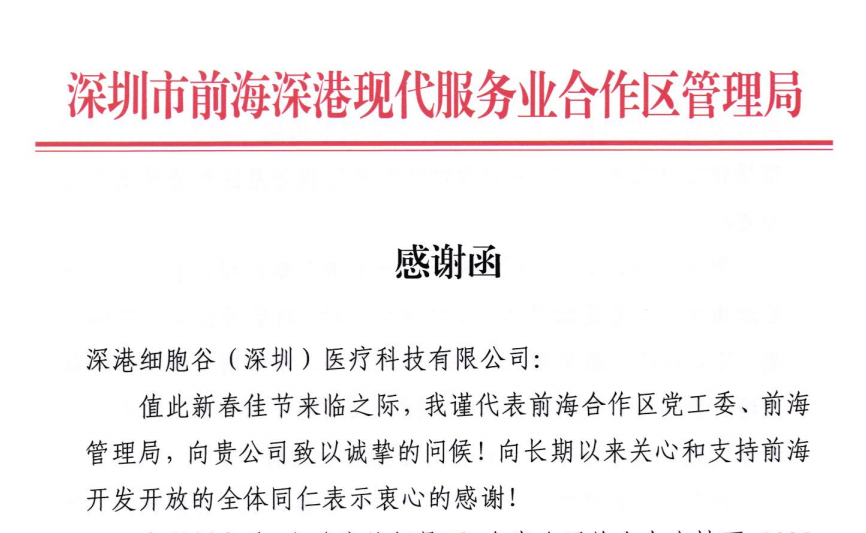 感谢函指出,在深圳市委、市政府的坚强领导下,前海持续深化改革开放、聚焦现代服务业与深港合作主线,各项核心指标稳步增长,开展动能持续增强。在此背景下,深港凯发K8作为落地前海的细胞与基因治疗(CGT)代表性企业之一,持续参与前海生物医药与现代服务业融合开展进程,在科研服务、产业协同及国际合作等方面取得实质性突破。