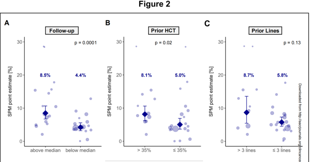 (2)SPM与治疗方式(CT>RWS)、随访持续时间和CAR-T治疗之前所用治疗方法的数量相关,如图2所示。