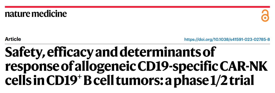 2024年1月18日,德克萨斯大学MD安德森癌症中心的研究人员在 Nature Medicine上发表了题为:Safety, efficacy and determinants of response of allogeneic CD19-specific CAR-NK cells in CD19+ B cell tumors: a phase 1/2 trial 的研究论文,在37例CD19+ B细胞恶性肿瘤患者中进行了一项脐带血来源的NK细胞表达抗CD19嵌合抗原受体和白细胞介素-15 (CAR19/IL-15)的1/2期试验。